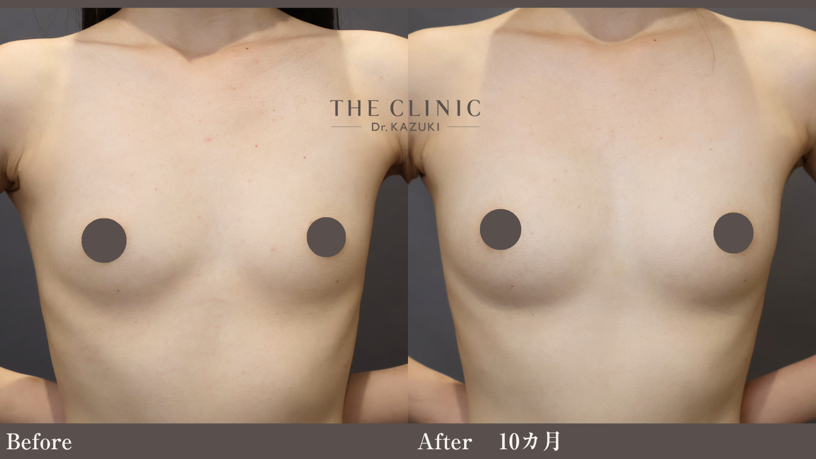 | 施術の説明 | シリコンバッグ豊胸を受けた方のおよそ10人に1人が、術後、拘縮にお悩みになります。バッグが被膜に締め付けられることで、バストが変形し、時にはテニスボールのように硬くなってしまうこの症状は、バッグの除去でしか改善ができません。こちらの30代女性ゲストもバッグを取り出し、同時に脂肪注入豊胸を行うことで改善しました。 |