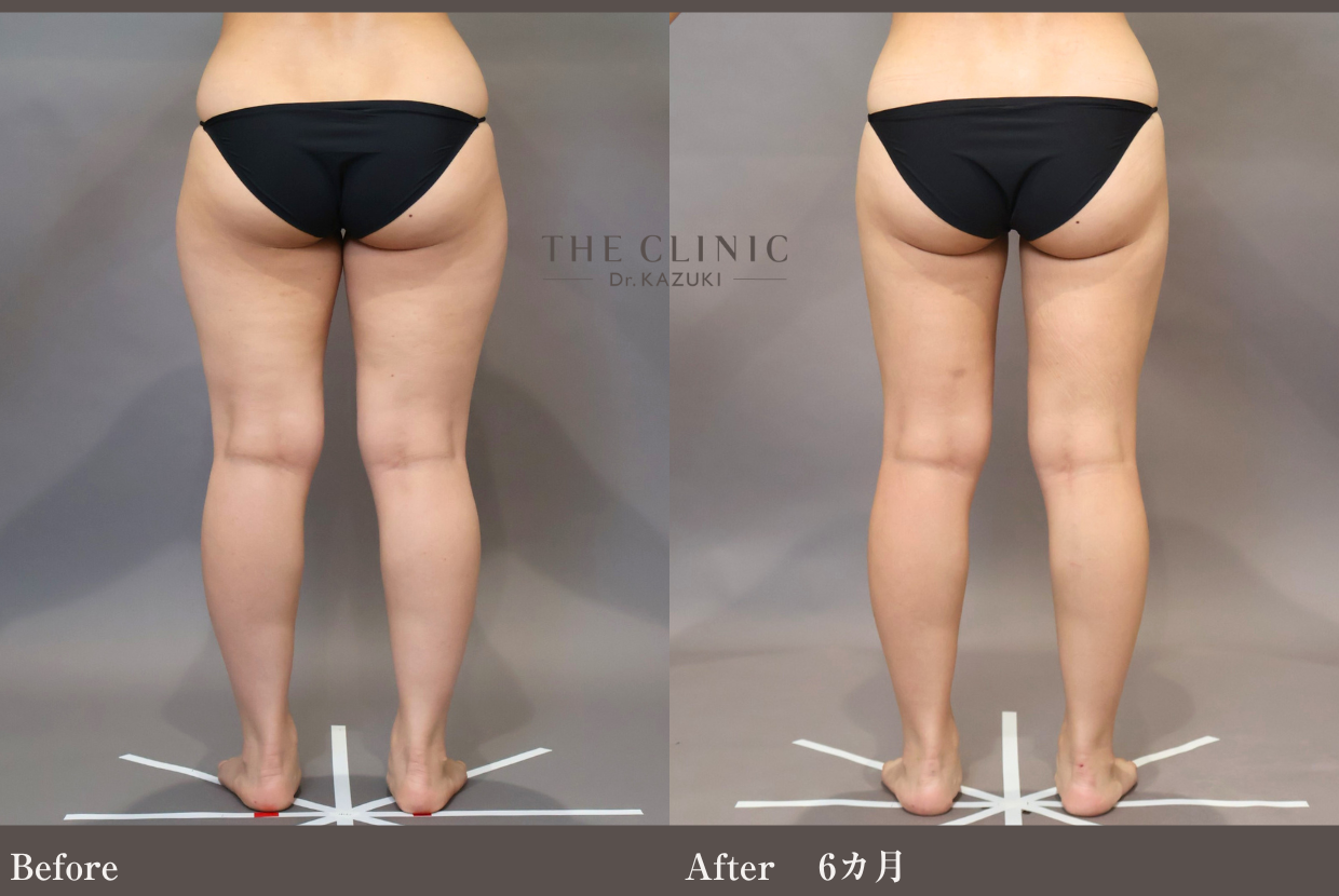 | 施術の説明 | 太ももの脂肪吸引は太ももを細くすることはもちろん、デザイン次第では、お尻の形をキレイに整えることも可能です。こちらの24歳女性は、太ももに皮下脂肪が蓄積され外側に張り出すことで、お尻が四角く見えていました。この張り出し部分をしっかり除去します。ほっそり太ももと丸いお尻の、女性らしい後ろ姿が手に入りました。 |
