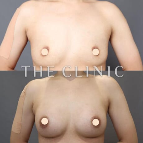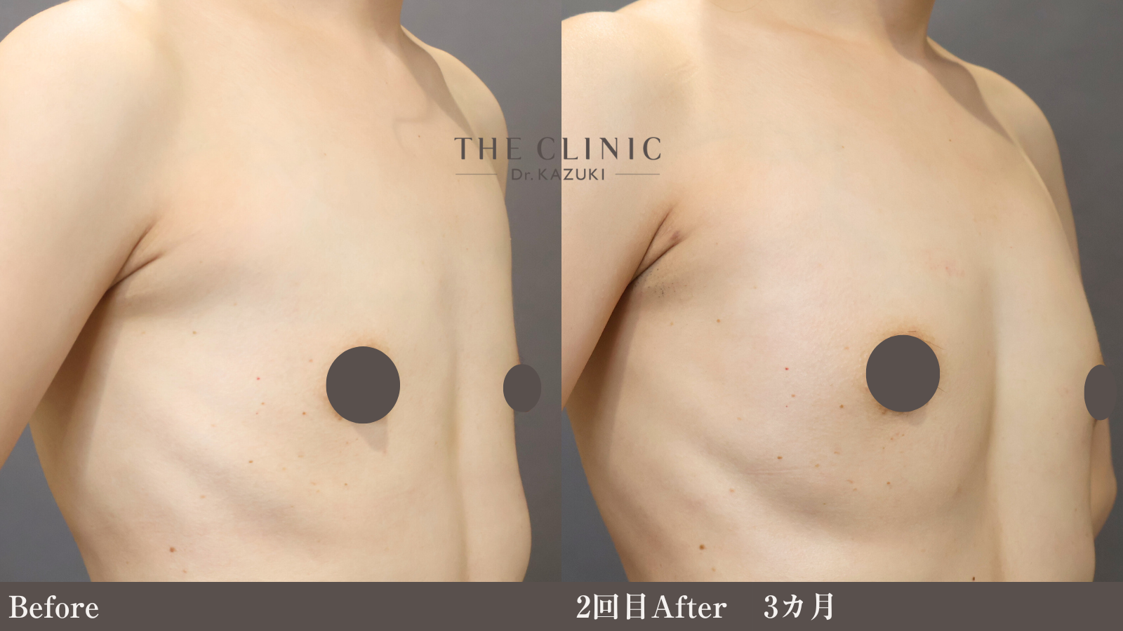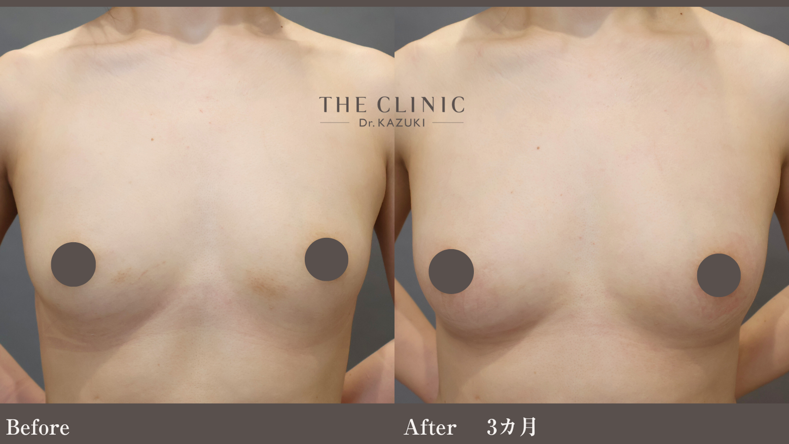 | 施術の説明 | シリコンバッグ豊胸を受けた方のおよそ10人に1人が、術後、拘縮にお悩みになります。バッグが被膜に締め付けられることで、バストが変形し、時にはテニスボールのように硬くなってしまうこの症状は、バッグの除去でしか改善ができません。こちらの30代女性ゲストもバッグを取り出し、同時に脂肪注入豊胸を行うことで改善しました。 |