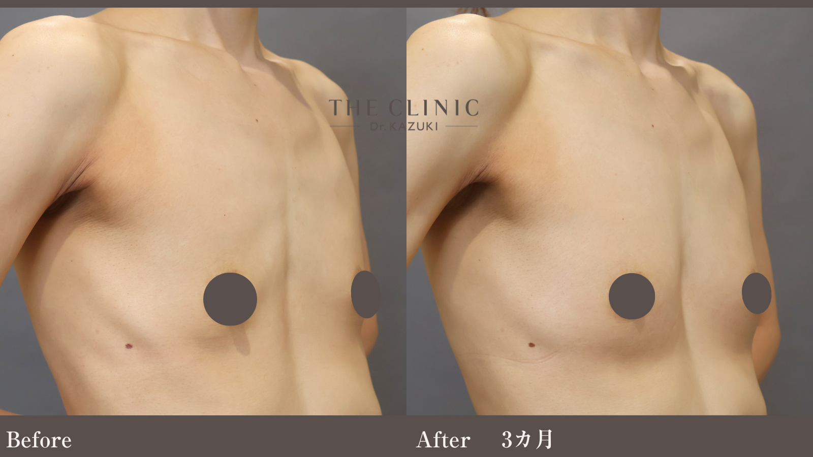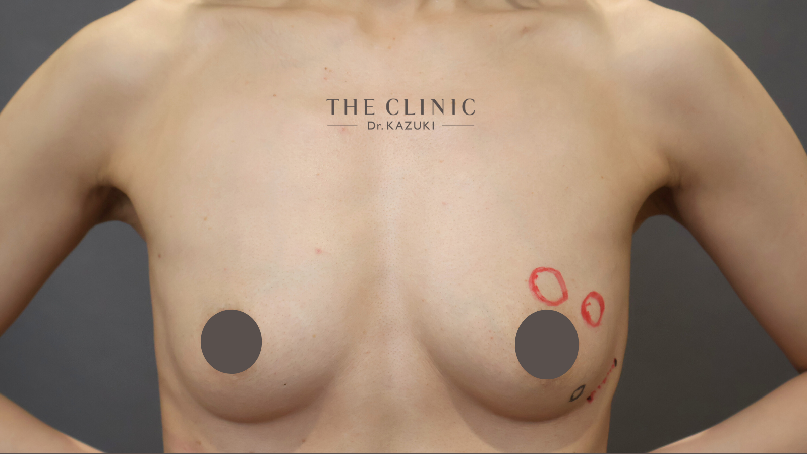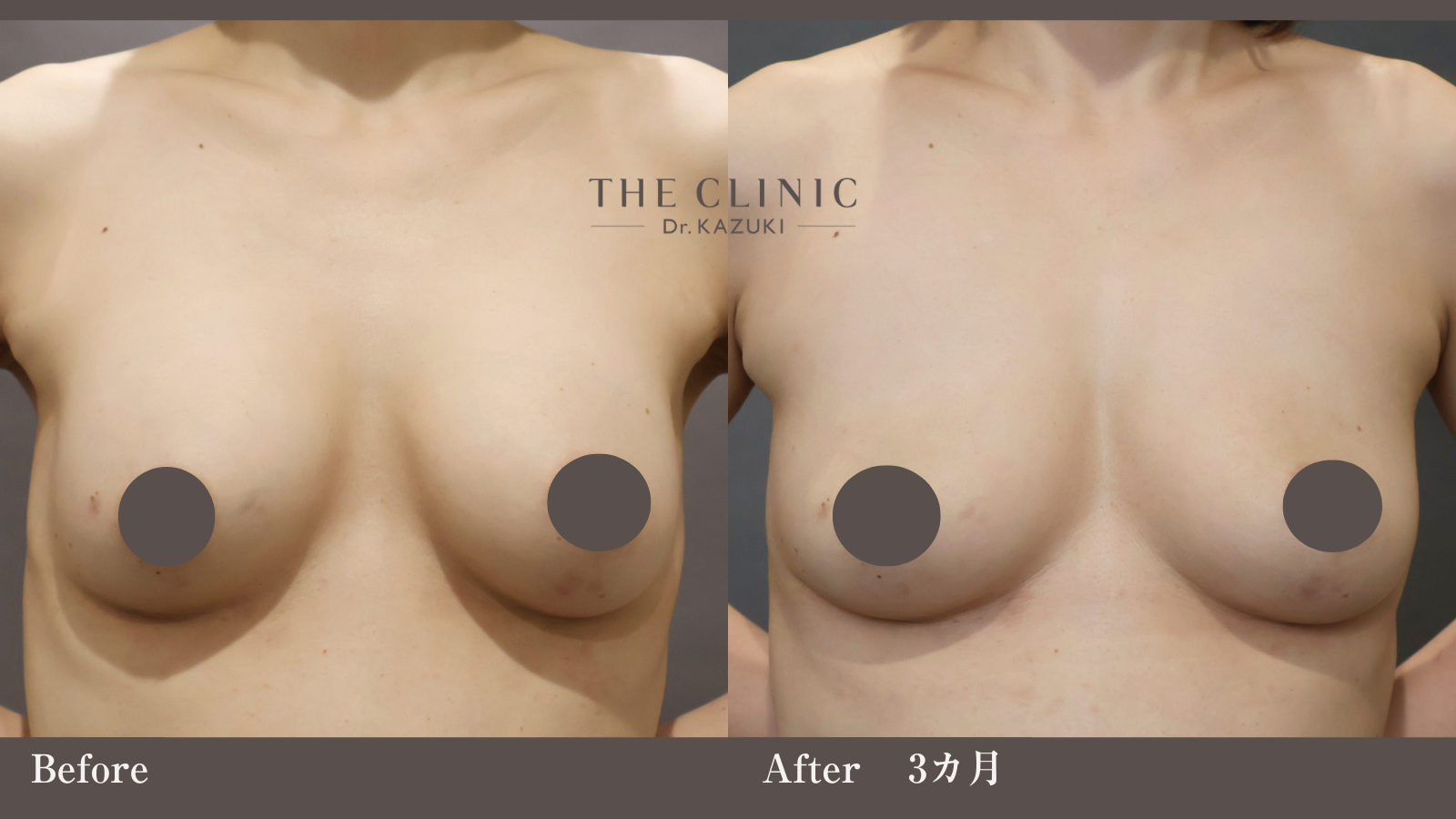| 施術の説明 | シリコンバッグ豊胸を受けた方のおよそ10人に1人が、術後、拘縮にお悩みになります。バッグが被膜に締め付けられることで、バストが変形し、時にはテニスボールのように硬くなってしまうこの症状は、バッグの除去でしか改善ができません。こちらの30代女性ゲストもバッグを取り出し、同時に脂肪注入豊胸を行うことで改善しました。 |