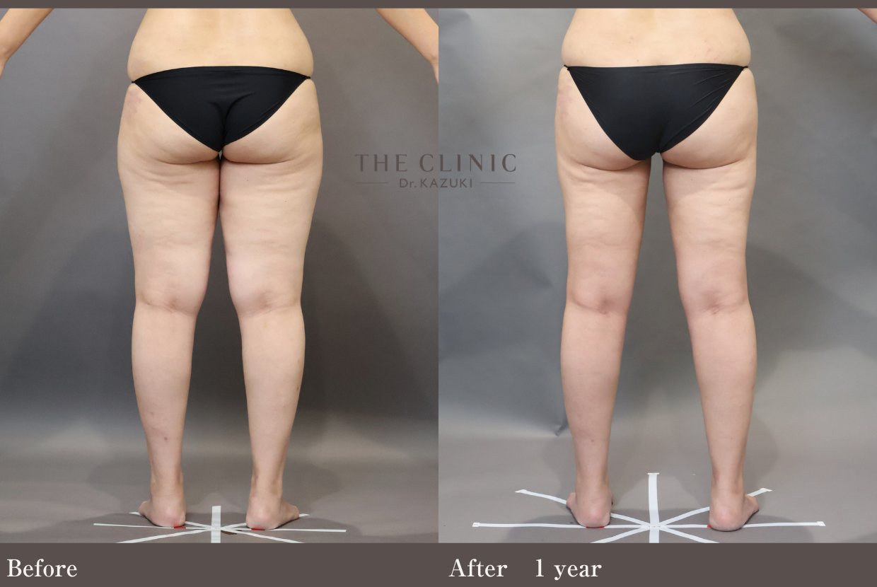 | 施術の説明 | 太ももの脂肪吸引は太ももを細くすることはもちろん、デザイン次第では、お尻の形をキレイに整えることも可能です。こちらの24歳女性は、太ももに皮下脂肪が蓄積され外側に張り出すことで、お尻が四角く見えていました。この張り出し部分をしっかり除去します。ほっそり太ももと丸いお尻の、女性らしい後ろ姿が手に入りました。 |